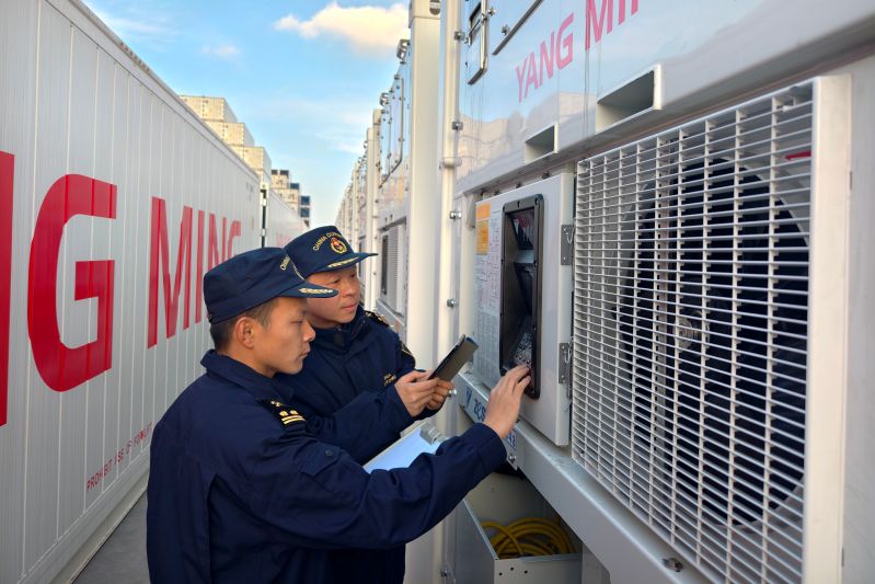 “冷藏集装箱作为货物出口,但同时又是一种大型载货容器,查验时既要核对冷藏集装箱的详细信息又要对其适载情况进行检验。”黄岛海关查检二处查检六科副科长王德政说,针对集装箱既是运输工具又是货物本身这种特殊的物流属性,海关前置风险分析,提升单证审核效率,并开通“绿色通道”到厂查验,确保当日验当日放,有效提升堆场循环效率,破解大量集装箱堆放难题,助推新造集装箱加速出口。